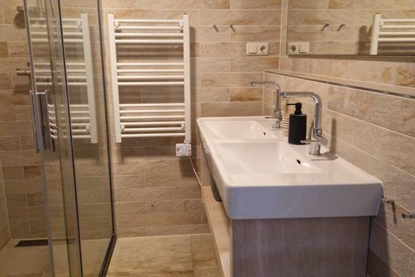 Untere Etage: Hier finden Sie zwei gemütliche Schlafzimmer, ein Badezimmer und eine separate Toilette. Eén Schlafzimmer verfügt über zwei Boxspringbetten und einen zweiten Flachbildfernseher, das andere Schlafzimmer hat neben zwei Boxspringbetten auch zwei Zustellbetten in Form eines gemütlichen Boxbettes – ideal für Kinder.